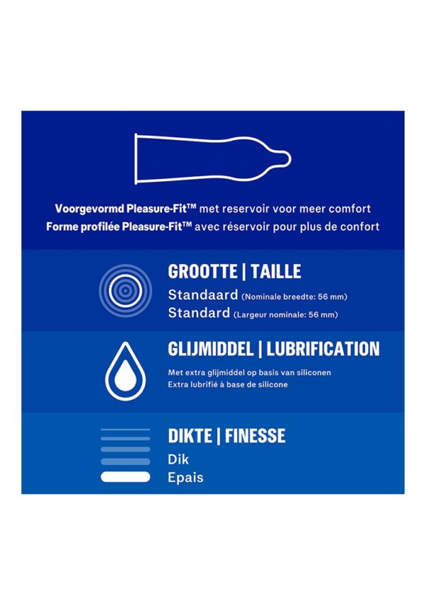 The Durex Originals Extra Safe condoms were developed for maximum protection during intercourse. Thanks to the slightly thicker latex and the extra silicone lubricant our Extra Safe condoms offer absolute security without having to settle for less pleasure. So completely relaxed. and don’t hold back.No form of contraception provides 100% reliable protection against pregnancy HIV (AIDS) or other sexually transmitted diseases. Read the instructions on the inside of the package carefully especially when using the condom for anal oral sex.